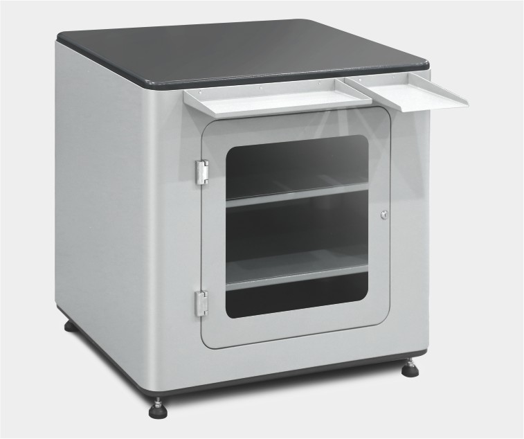 Postazione di lavoro solida con spazio di archiviazione pratico e a vista per lo stoccaggio di materiali e utensili.